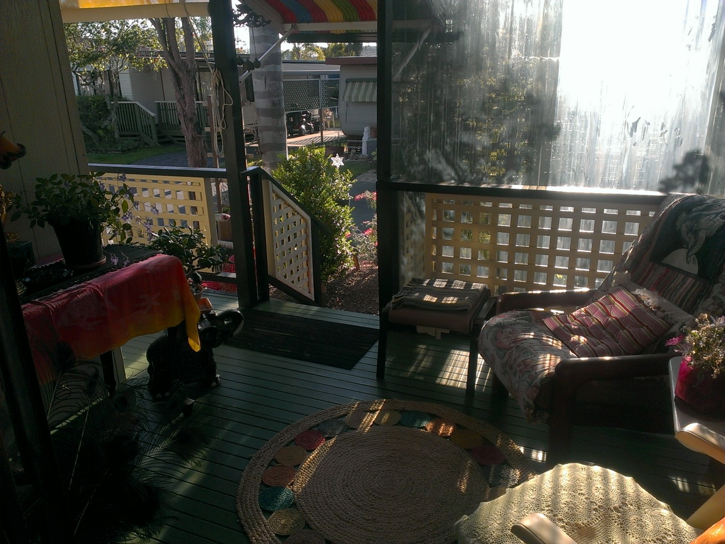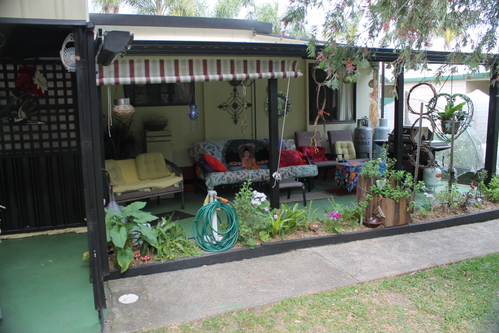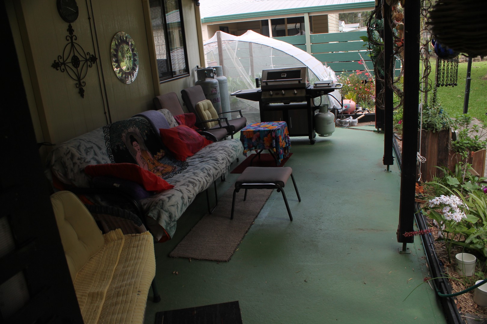 Covered carport has room for two small cars. Also, a 3 x 3m shed and a lockable workshop with power, currently used for a craft room.
