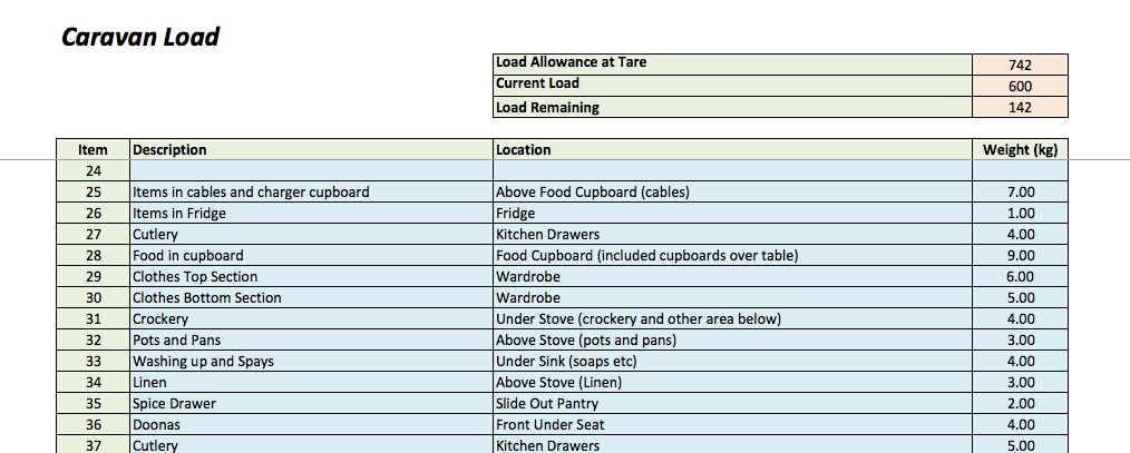I mentioned this a friend on a Face Book Group for Retreat Caravan Owners, (John Halford, a man who has a very good understanding of how to use Excel), if he had considered developing a tool to help calculate loads. He had, and the result is an excellent multi worksheet spreadsheet that allows the user to determine not only the weight of the loads, but even better, it will show what impact on the ball weight placing an item in a given position will have. This is done by taking measurements of the various storage location from the centre of the axle (single or double axle) and using this measurement to calculate impacts.