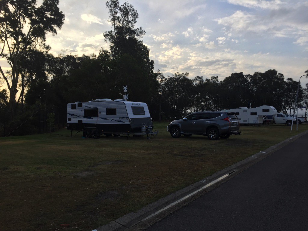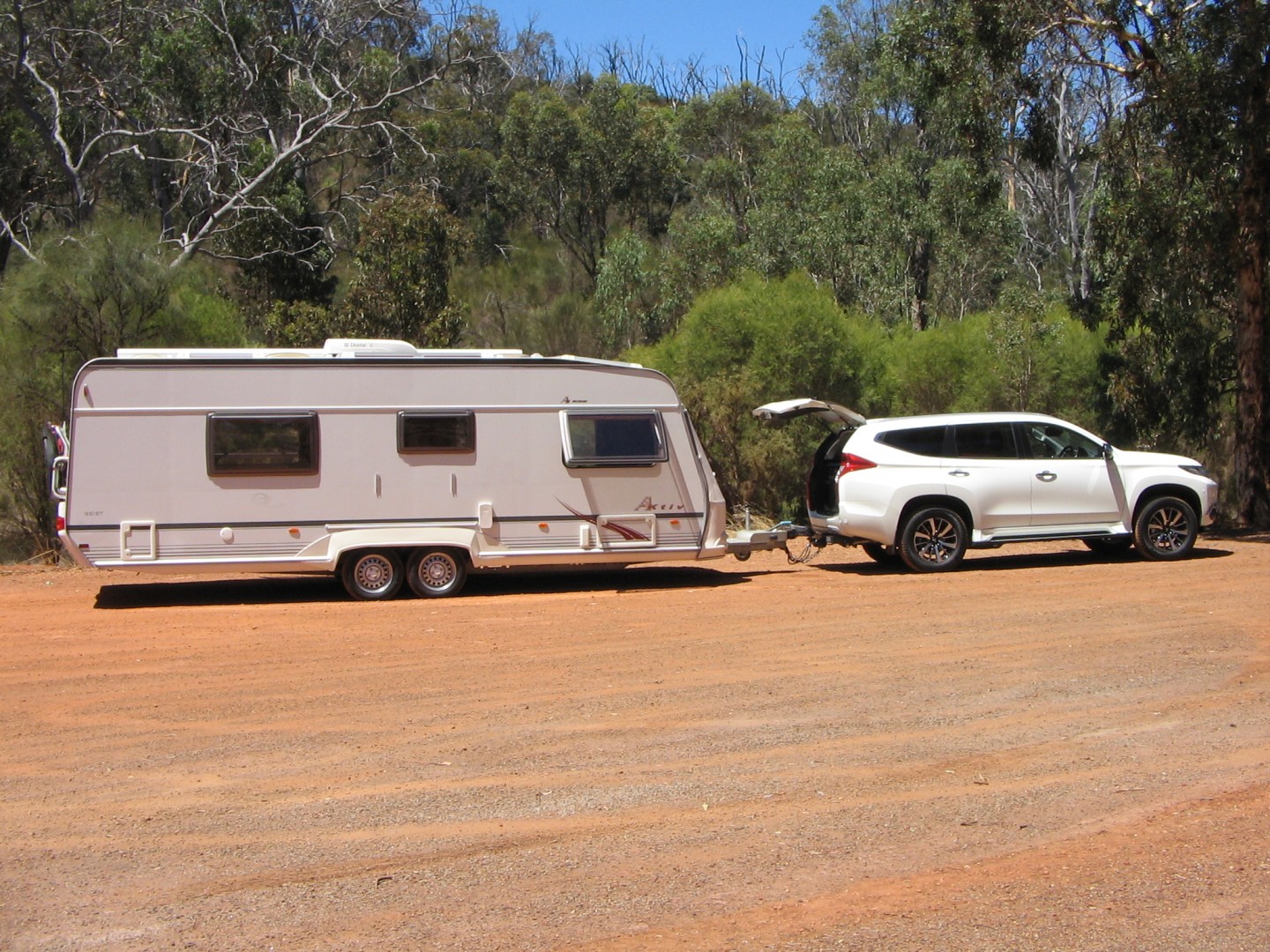 On a trip the van normally weighs between 2600kg and 2700kg loaded with a 260kg ball weight (tanks empty). I use a WDH with rear air bags in the coils to stiffen the suspension, the Sports handles the weight pretty well especially with the 8 speed transmision but is a bit thirsty and has a small fuel tank which gives it a limited range between fills (350 - 400kms). I posted this because plenty of people have been asking me lately about the Sport as a tow vehicle particuarly some of the full size Pajero owners.
