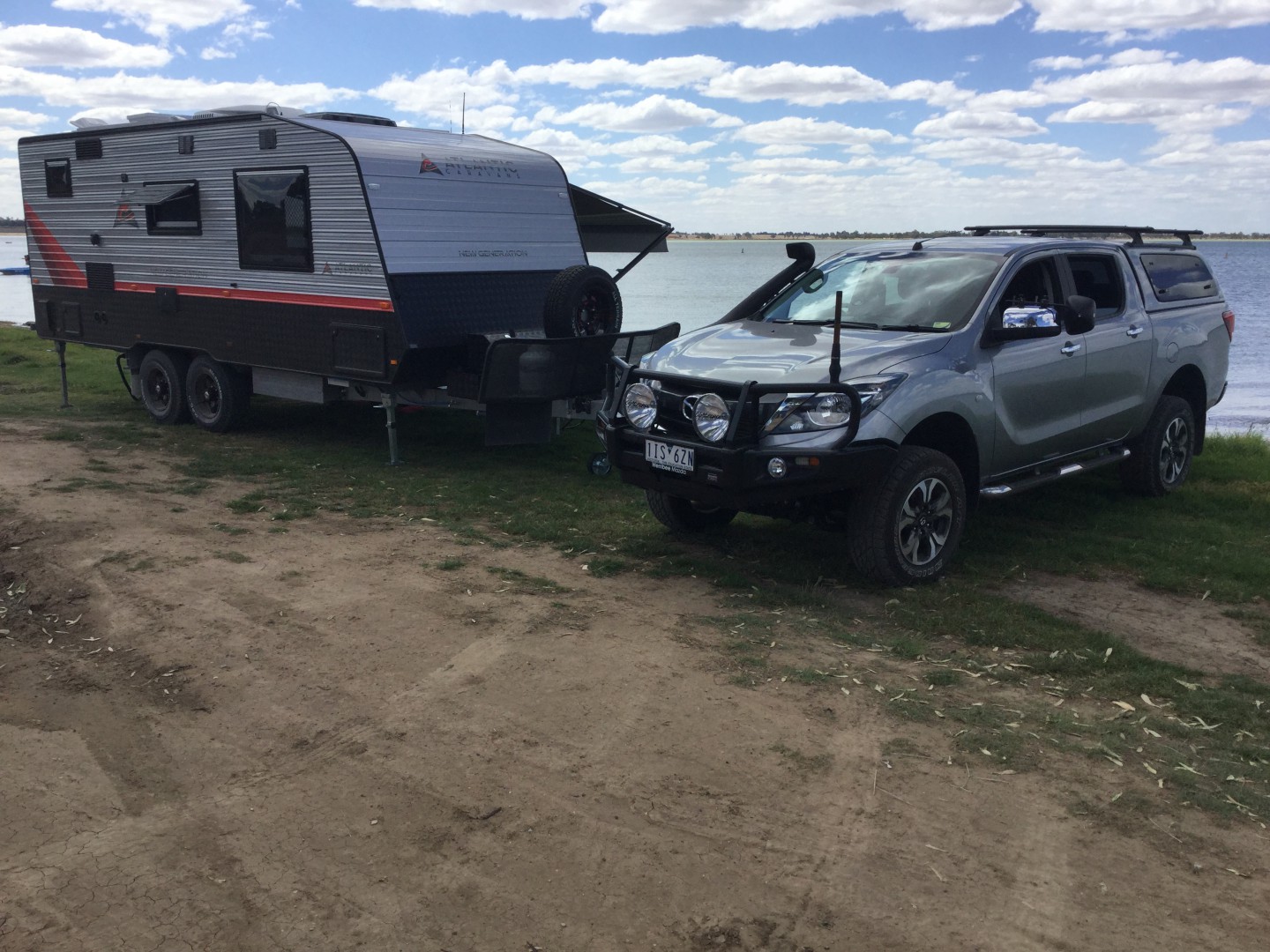There is another spare on the rear bumper as well. With both spares at the rear, the ball weight was too light for my liking, so the manufacturer added the second to the front before we picked the caravan up. It should have been underslung forward of the axles, but an extra water tank was added that meant the spare would not fit in its original position. Fully loaded, the ball weight is around 240-250, with an all up travel weight of around 2.9 - 3.1t, depending on how much water I choose to lug around. The ATM is 3.5t.