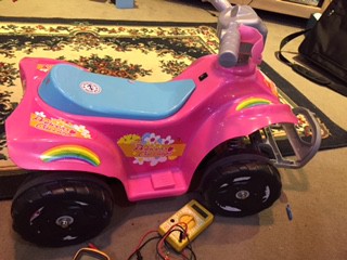 I need some 12 volt help.. Daughter found this $3.00 kids ride on car with a couple of problems. The axle needed restraining because of broken plastic bit. Easy fix. The 6 volt battery was being charged with a 12 volt charger which wrecked the battery. I used an old genset 12 volt battery to get it going. Of course goes like a V8 now drawing approx. .75 amp at 12 volt. Now need to have some control over the speed. Slower for the learners and flat out for the older kids. I had saved an old variable speed cordless drill trigger so connected that and it worked so put a cable tie around it at approx. 3/4 speed.