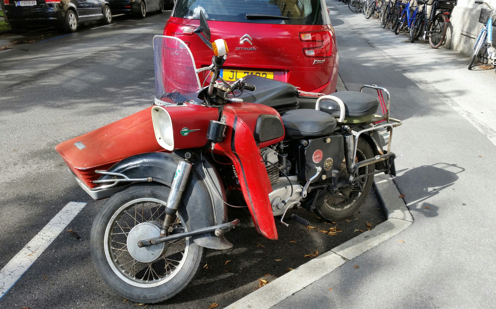Saw this motorcycle with a side car oufit while out walking around Innsbruck, Austria, a daily rider, parked in the same spot most days but not parked there of a night.