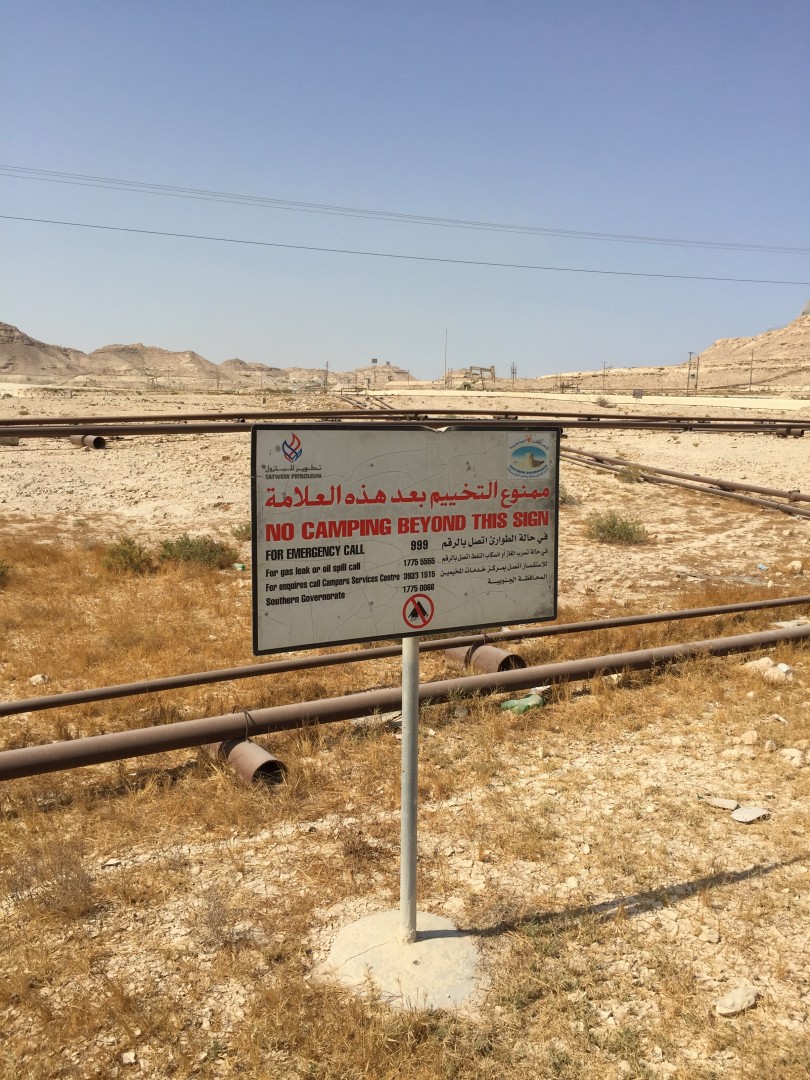 Driving around today in the balmy 43deg Bahrainian weather I was very disappointed to come across these signs which have been put up in some of the prime camping areas on the island. I thought that the spaghetti work of pipes, bobbing derricks and pungent smell of oil would have been a magnet for free campers but apparently the government authorities have other ideas.