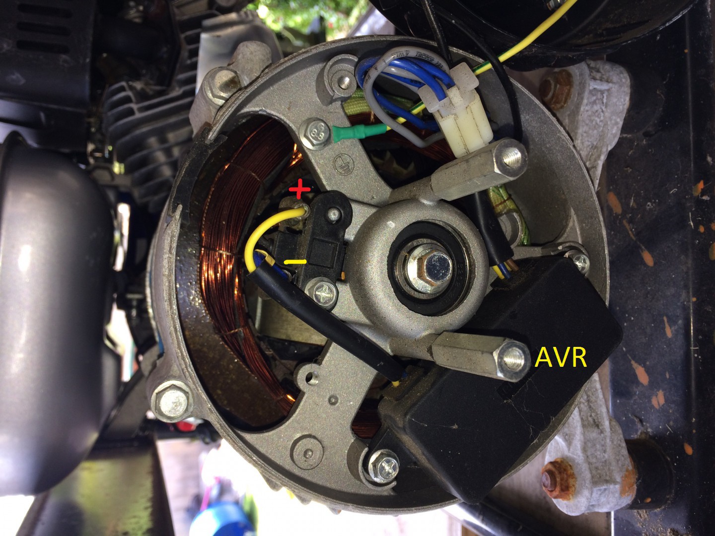 Have marked the AVR, these are on Ebay quite cheep. But the first thing you need to do is remove the Positive & Neg push on terminals on the brush holder. Then using some leads flash 12V DC on the brush holder (observing the polarity) Then reconnect terminals & it will probably work. If not get back.