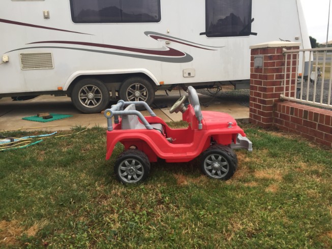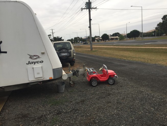 Son in law facetimed me this morning saying he was at the tip/transfer station and there was a Jeep 12volt two seat electric kids car for $10. I told him to buy it and I would see if I could get it going. It needed the Pajero to get it so off I wandered. This arvo was babysitting for the other family so Edwin was here to help Pa. The car belongs to his cousins. Both rear wheels have their own electric motor. Battery was down to 7 volts so connected my lipo jumper and nothing. Next was to test each wheels motor and all ok. Found the problem in a Pa fixable switch. If the battery is stuffed it is only $18 for a new one. I am top of the Grandies pecking order at the moment.