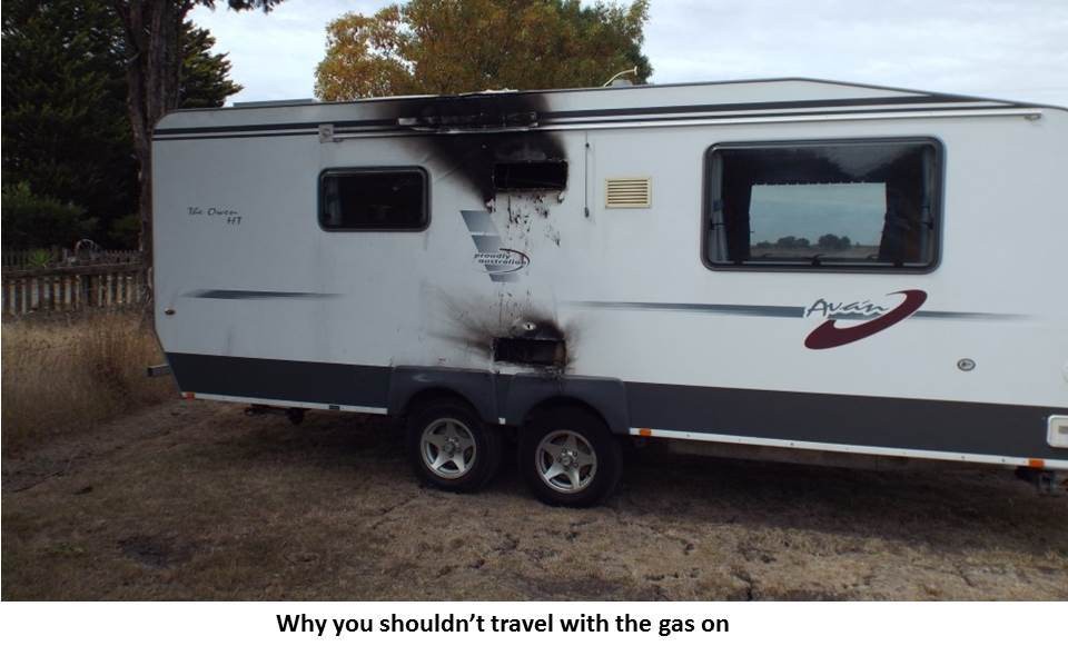 I guess no one ever plans to have a fire or plans to put the van on its side, but the photos and reports say such things do happen. Once the gas bottle goes over on its side or upside down, it is liquid that comes through the regulator, not gas. That liquid expanses to 270 times the volume of gas when the liquid get out of the jet, one real big flame. I'm sure I wouldn't want to be in a vehicle that has tipped on its side tangled up with a potential fire ball like that, so I never travel with the gas on because I don't consider it is safe. If you need to run the gas to save the food while travelling because the 12v wiring is crook, might be a better move to sort the wiring problem, certainly a far safer move. So many concerned folk have a shot about RV's that run 240vac via an inverter when travelling referring to risks to rescue personnel, a completely unfounded concern by the way, but you never hear a word about the risk to rescue personnel from the gas being left on and blowing them to bits in a big fireball explosion.