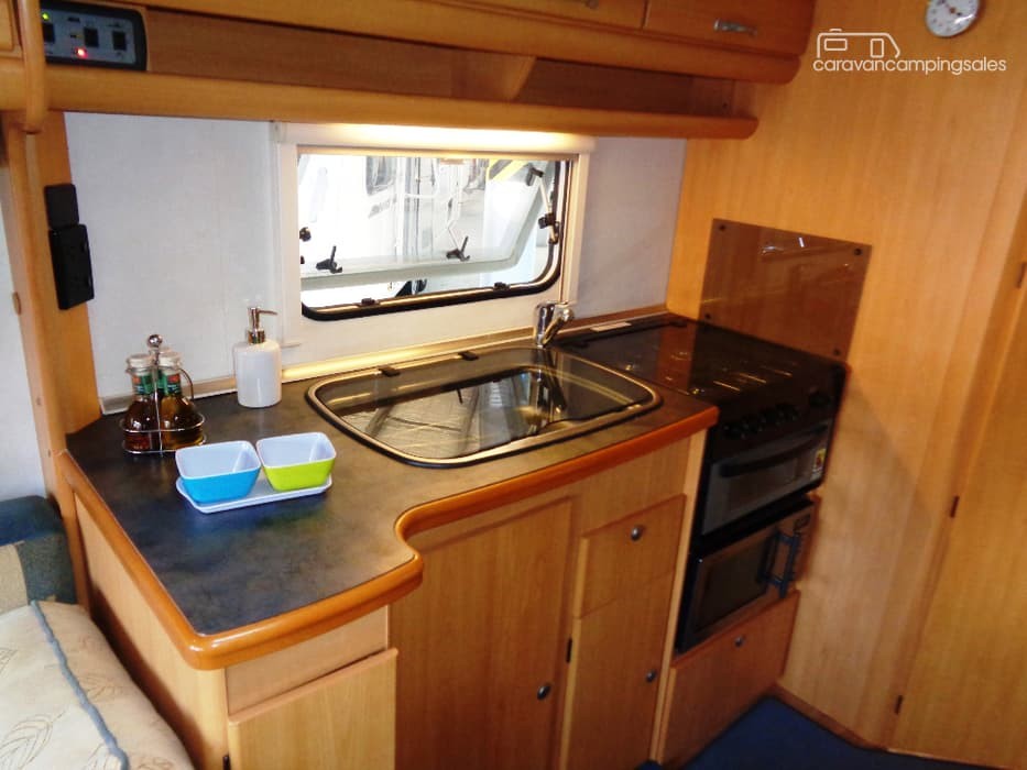 Forward twin bed/couch's, centre medium kitchen, rear fixed double bed, toilet in shower. No awning.