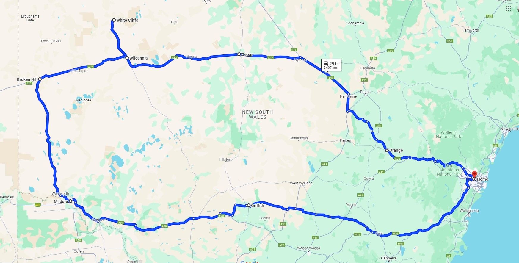 Thinking of coming home from Broken Hill by what Google Maps shows as the most direct route - through Menindee, Ivanhoe (probably overnight), through to Hillston and Griffith.
