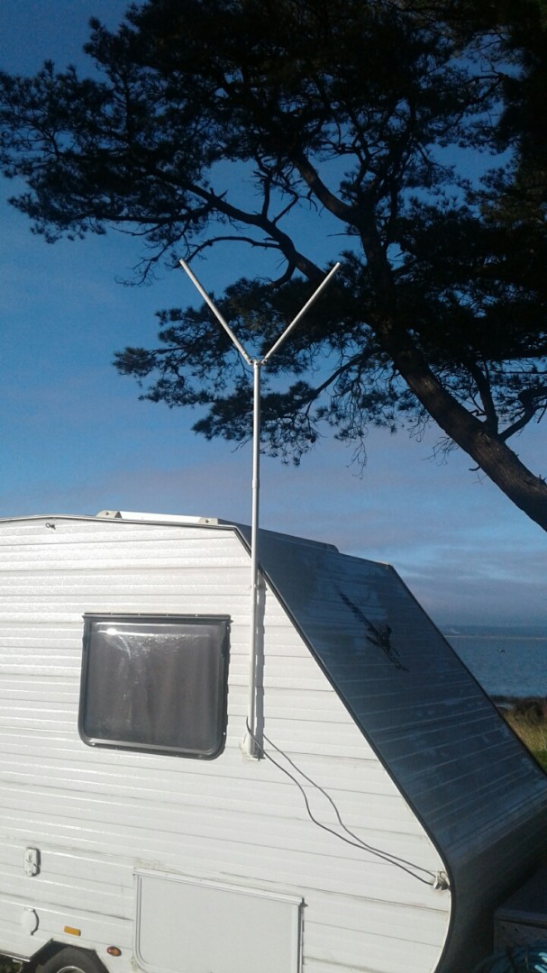 Standard TV Aerial with folding elements can be carried on bed. Portable aerials don't work too well in van