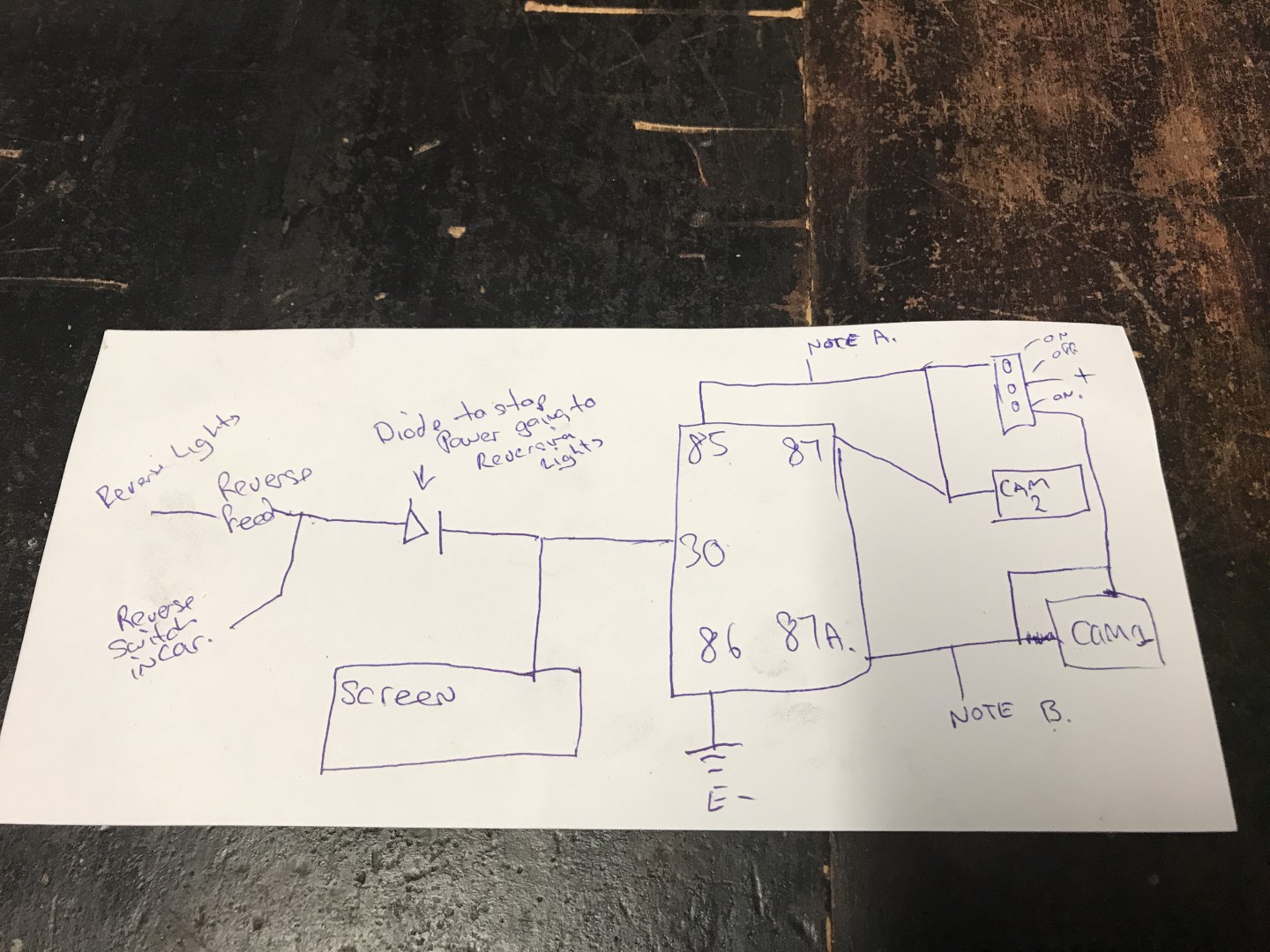 Redx2 this is how I wired mine I have Three way switch in the dash in the off position the camera operates as a normal reverse camera . Flip it up ( note A ) it powers up camera 2 and the relay to give power to activate the screen . Flip it down ( note B) it powers camera 1 and sends power though the relay to activate the screen . There is also a diode to prevent power returning to the reverse light when using the three way switch .