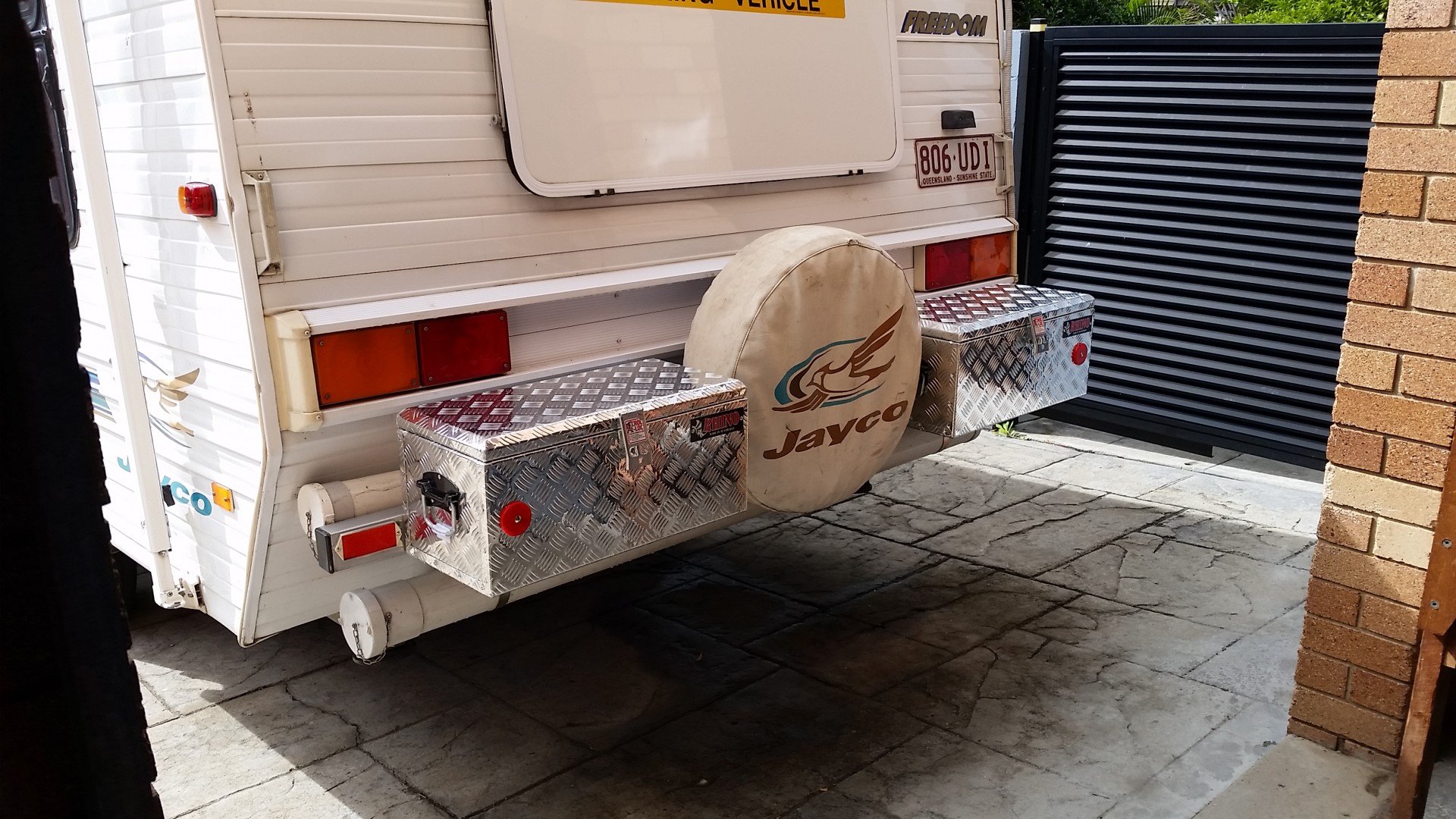 Hi, I mounted 2 boxes on rear bar either side of spare wheel,(Jayco Freedom tandem axle) items inside are light weight (wood wheel ramps and water hoses) I needed to stop the front boot from being crowded, Aluminium boxes came from Bunnings plus some flat steel bar I shaped and bolted to support and hold the boxes against the rear bar.