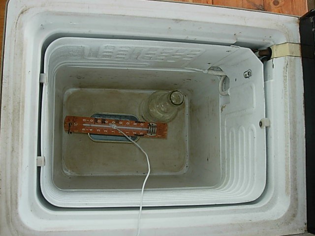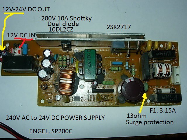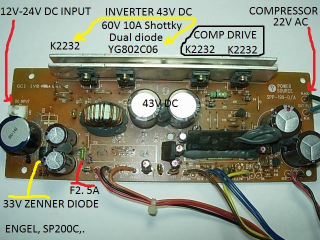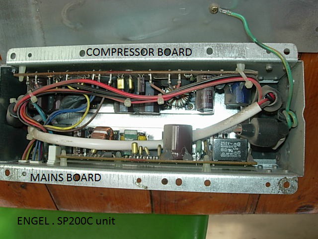 Picked up this little Engel fridge from local scrap yard free. A good clean up & paint job on the metalwork, & it seems to work quite well. It cycles around minus 16 deg C as a freezer, & 1-2 degC as a fridge. A few pictures of the power boards just for any one who may be interested in repairing one. The build date was 2002 & the power unit is SP200C. There is 2 boards, one is a 240V AC to 24V DC. The other board has a DC-DC Inverter that steps 12V or 24V DC up to 42V DC, This is fed to the Inverter that drives the Compressor with 50 Cycles of 22V AC. There are 3 Fuses on the boards.