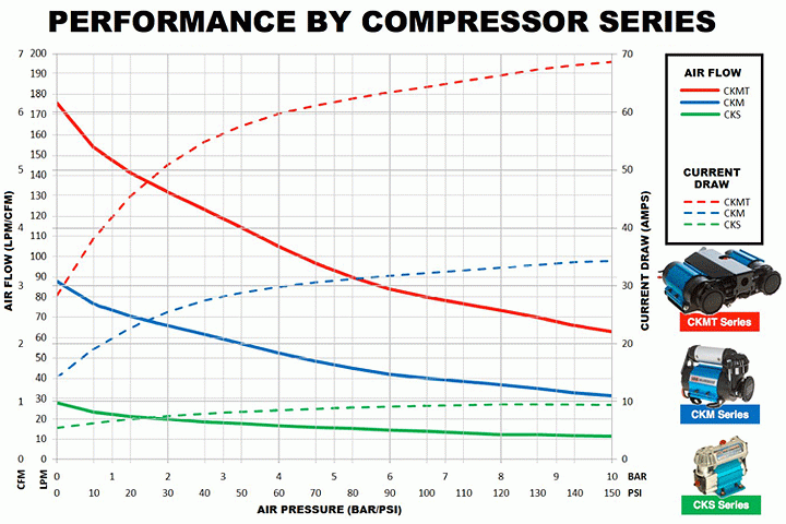 3 ARB compressors will do 60 litre tyres, 20 to 35 PSI in 30 seconds or O to 45 PSI for the spare in 90 seconds.