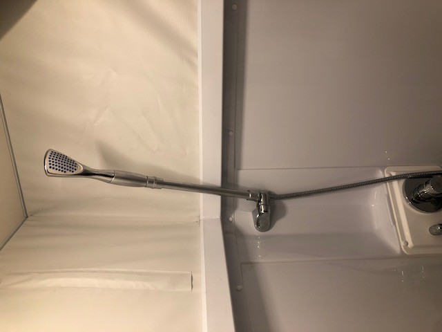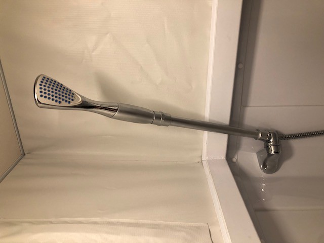As anyone who owns a pop top with a shower knows, the shower head is very low.