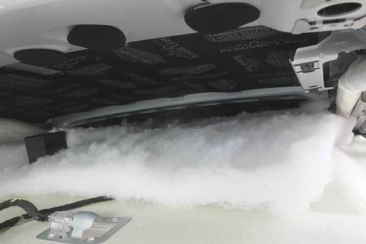 There is a hole roughly 5cm to the bare metal floor, so stuffed a lot of offcuts of pyramid foam in through the pairs of small holes through the carpet.