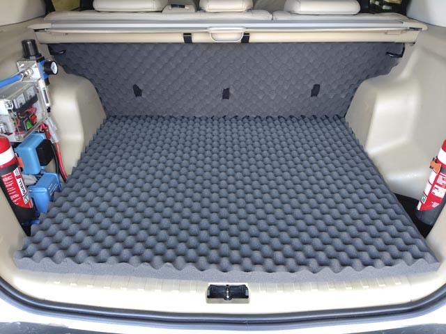 Being bored to tears thought I would experiment with some 50mm acoustic foam in the boot & a few more bits in the spare wheel well around & in the wheel rim.
