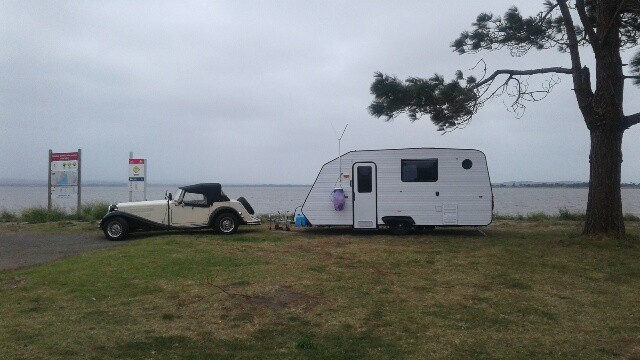 Caravan built 2019 16ft with full ensuite. Tare 730kg. ATM 998kg, Steel tube frame, 4" drop axle, lightweight materials. Concept was to add a few vintage bits like spats, pointy tail lights and portholes but aerodynamics at the front are modern for efficiency.