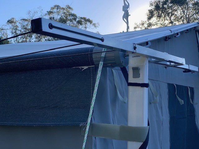 pic 2 is a pretty good one. Basically there is two 25mm flat alluminium (x2) pop rivetted top and bottom which then slide over the awning arm, they have a hole in them drop a stainless bolt though tighten with a wing nut. Just a tip because of the gap between the leg and the arm I pop rivetted two bits of channel to hold the 900mm length solid away from arms otherwise there would be movement when line is being used. hope this helps the van is packed up with a cover on so more picks aren't on for awhile.
