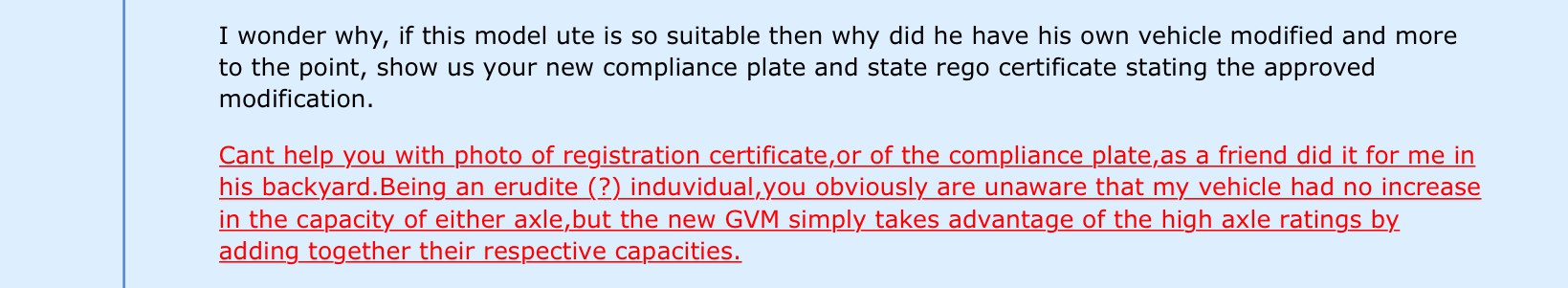 The very member has, by his own admission, had his ute upgraded but has repeatedly denigrated anyone who has had used an approved manufacturer to have a GVM or GCM upgrade carried out. Repeatedly, other members on here have posted pics of compliance plates and registration certificates as well as links to information from approved secondary manufacturers only to be openly criticised.