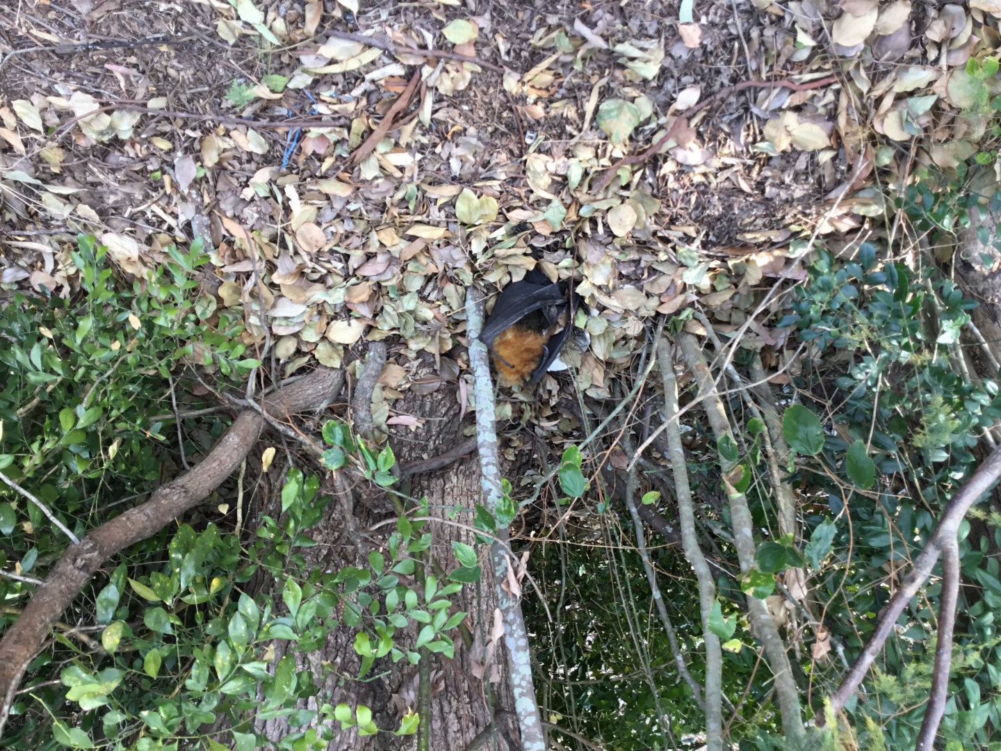 came across a dead flying fox On wednesday under a tree. A very hot day. we have been putting out water for the animals. Its so dry. Sorry photo is upsid3 down.