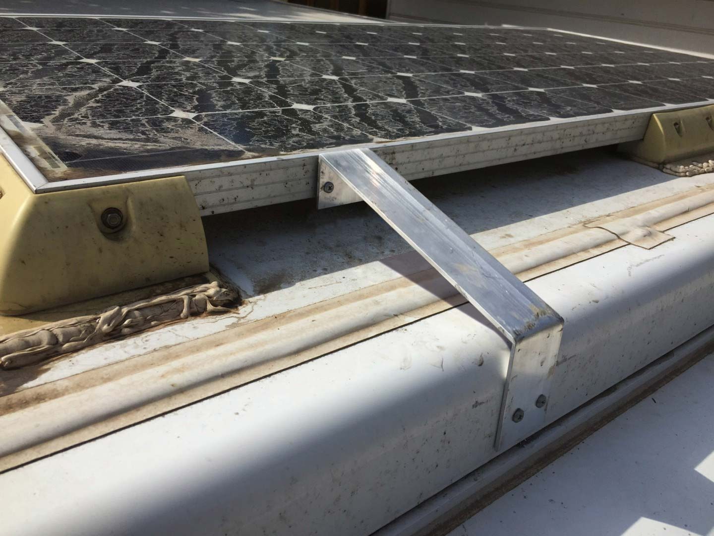 On fibreglass or metal roofs, proper application of appropriate Sikaflex to bought expensive mountings or cheap homemade lengths of aluminium angle is all that is required to keep panels in place under the most severe conditions.