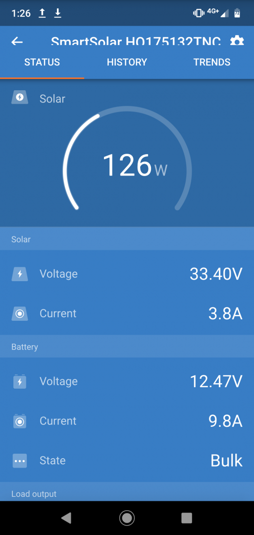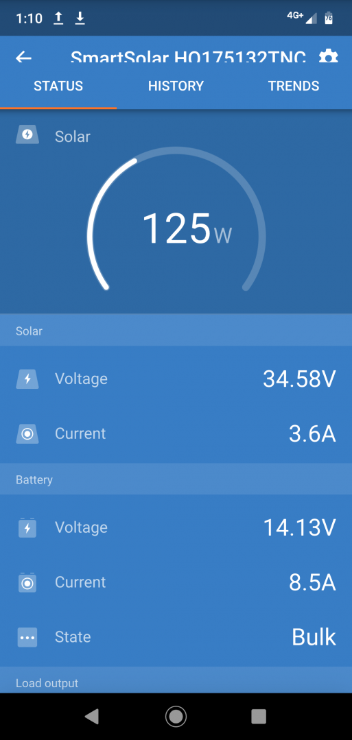 At 12.47volts 9.8amps, so 98amps with 1200 watts of solar.