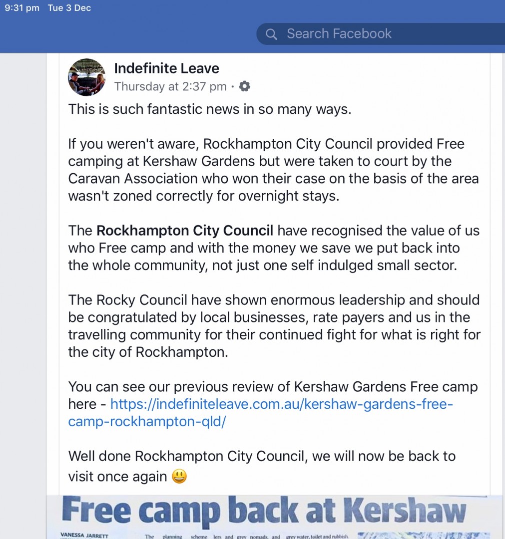 I stay in CVP's, Free Camps, Low Cost Camps, Showgrounds, so spread it around and enjoy myself, and I say well done Rockhampton Council. About time a Council realised there are more businesses that CVP's. I am 100% sure that other businesses around Rocky will benefit as would other Councils if they did the same.