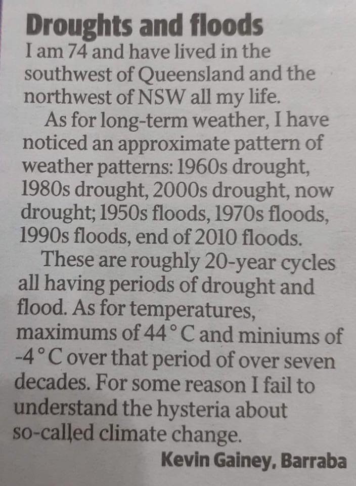 An interesting link and what a shame that the man of such standing has now been indoctrinated into supporting the greenies and their ridiculous demands on our disaster management.