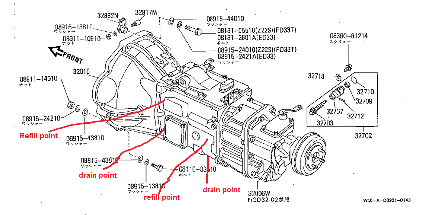 On transmission case / gearbox case there a few different drain and refill points. See picture, im not exactly sure if the locations are correct but there is definitely 4 holes.
