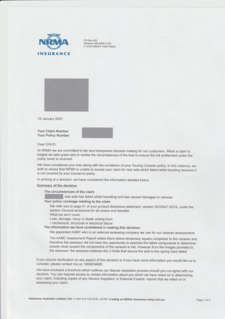About 6 weeks ago I posted on here about an incident that we had when the rear axle of our van came adrift travelling at around 95kph. Today I recieved a phone call completely out of the blue from the NRMA insurance who rang to inform us that they had decided they would not be covering the cost of the damage as it had likely been caused by either a mechanical failure (Ubolts) or a tyre blowout. I told them that for over 30 years we have had all of our insurance policies including greenslips and premium roadside assist etc. etc. with this mob and up until now we have never made a claim. I also said to the young lady that if this was going to be their final decision as soon as I got off the phone I would be cancelling everything with NRMA and moving our business elsewhere - as of midnight tonight we will be with APIA. I really wonder with the cost of these fires if the insurance companies aren't looking for ways to recoup some of their losses. According to both the caravan repairer and the NRMAs assessor the claim would have no problem being approved, the assessor even said to us you can tell your repairer to go ahead and order the parts..
