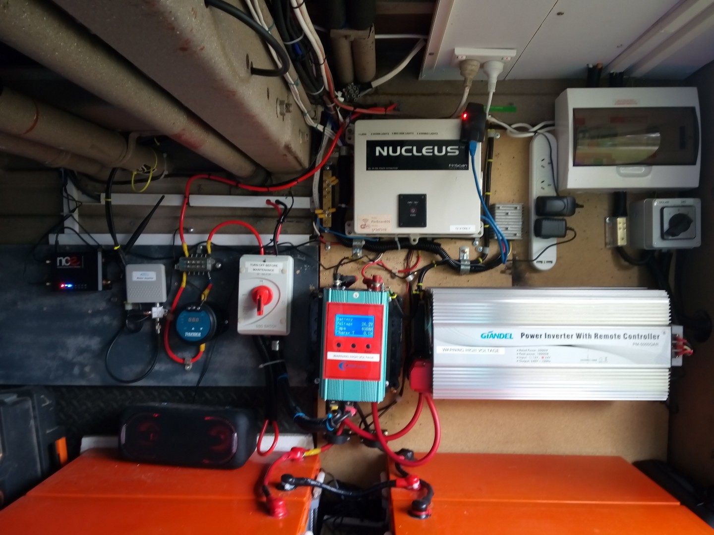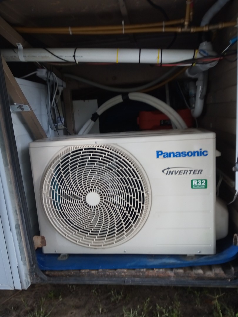 Where is the air conditioner condenser & if you are happy to elaborate, what is the solar & battery setup like to power the Life of Riley!