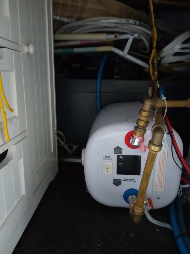 The hot water supply is 10Lt with 2 stage auto power run's on 240v @ 1000W or 12v @ 800W