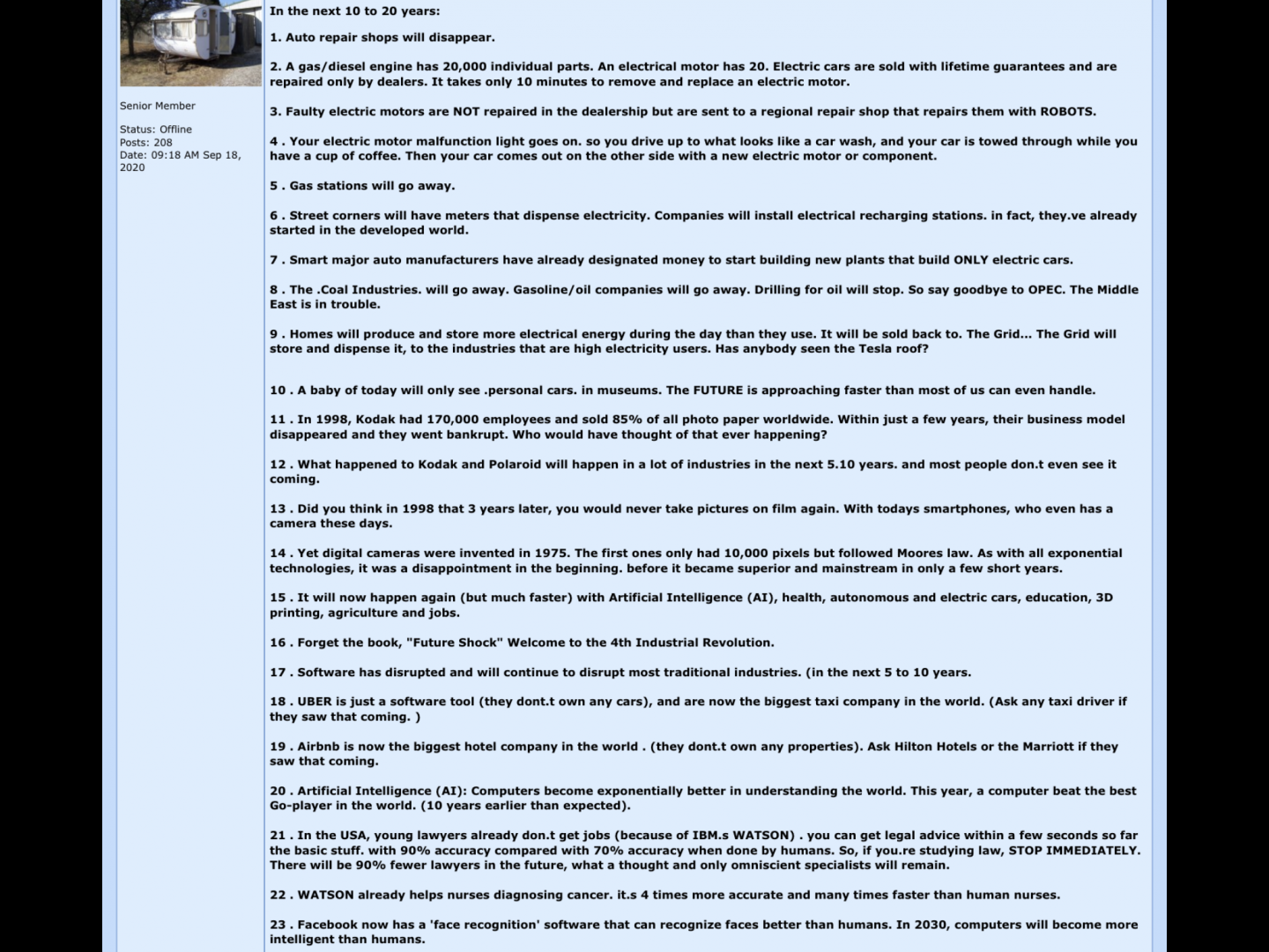 28. Most traditional car companies will doubtless become bankrupt. They will try the evolutionary approach and just build a better car. while tech companies (Tesla, Apple, Google) will do the revolutionary approach and build a computer on wheels.