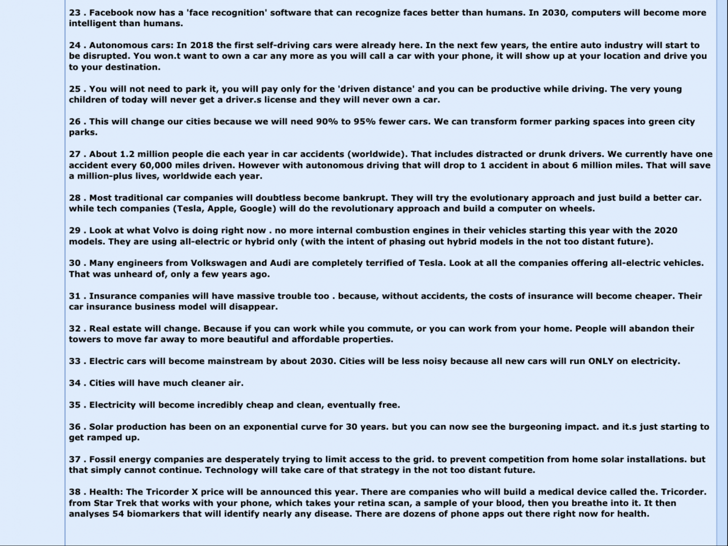 24. Autonomous cars: In 2018 the first self-driving cars were already here. In the next few years, the entire auto industry will start to be disrupted. You won.t want to own a car any more as you will call a car with your phone, it will show up at your location and drive you to your destination.