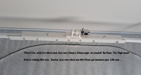 Obtain gold plated Toyota Mag wheel nut and stud, the some fiddly welds onto a piece of 8mm plate, to stand it off the 25mm angle, then bolt onto existing lift arm arrangement, use high tensile bolts as stainless ones bend.