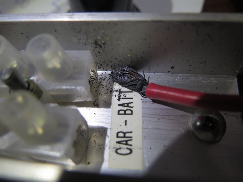 I've removed the diode device and taken another pic of of the BATT wire which as with the car wire has clearly been overloaded. This is strange because it connects the car to the house battery with the device in between. Must have been some serious current passing from the car to house battery!