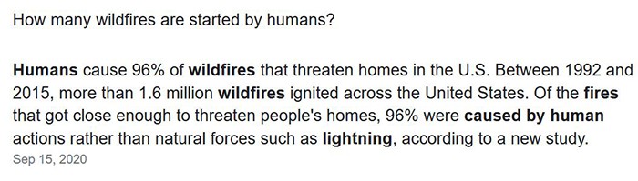 Last season it was reported that only 2% of bushfires were started by humans, and this exactly agrees with figures quoted by rangers in a national park in Canada.