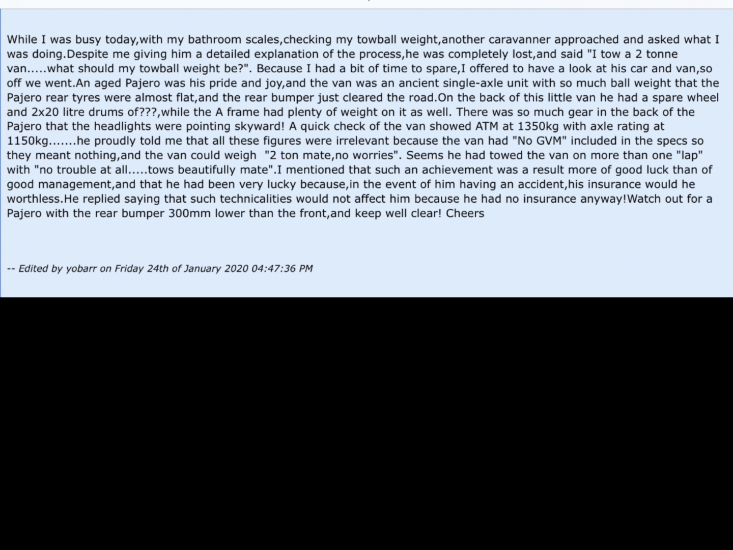 Hi Bob...I agree with your suggestion that a list of cars be drawn up,with claimed towing capacity,actual towing capacity,(and why that claimed towing capacity is not achievable with a PIG trailer) tbw,GVM etc,but axle weights are critical, as this is what people don't understand.Your setup might be fine for GVM,fine for towball weight,fine for GCM and fine for ATM,but usually the rear axle is the limiting factor.This may be fine for the scalies etc,but if you have an accident,and you are found to be overloaded on the car's rear axle,you're gone.Very few cars can carry much in the 'tub' or back of the car if they are running with the universally accepted 10% safe towball weight and a heavy van.One of the most important things,in my view,is that we illustrate how a WDH works,as most seem to believe that it reduces towball weight.It does not.Any weight is removed from the car's rear axle,with about 70% of that weight going on to the car's front axle,and 30% onto the van's axle group.Because towball weight has not changed,but there is more weight on the van's axle group,you may well exceed your GTM and,indeed,your ATM rating......no insurance. It might be best if Mike simply gives me a list of questions,which I will answer,along with detailed explanations of my reasoning and my calculations with each reply.Because diplomacy has never been my strong point,he then might like to edit my stuff,I could check that any intended meaning has not been inadvertently altered,and it could be documented.I am happy to run with whatever Mike suggests,but I am not flash on computers,and know nothing about such things as Microsoft Words etc.Just spotted Mike's suggestion that any document be subject to a "satisfactory peer review", but I'm not sure what this means? If it means that the document will be scrutinised by the very people we're trying to teach,we're snookered on the black......but I may well be misunderstanding Mike's intention.Cheers