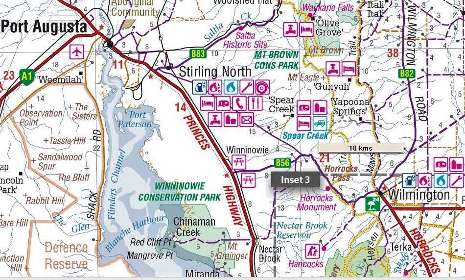 A bit past Port Germein east of the range is a 24 hour rest area, on the corner of Horrocks Hwy & Wild Dog Creek Road North.