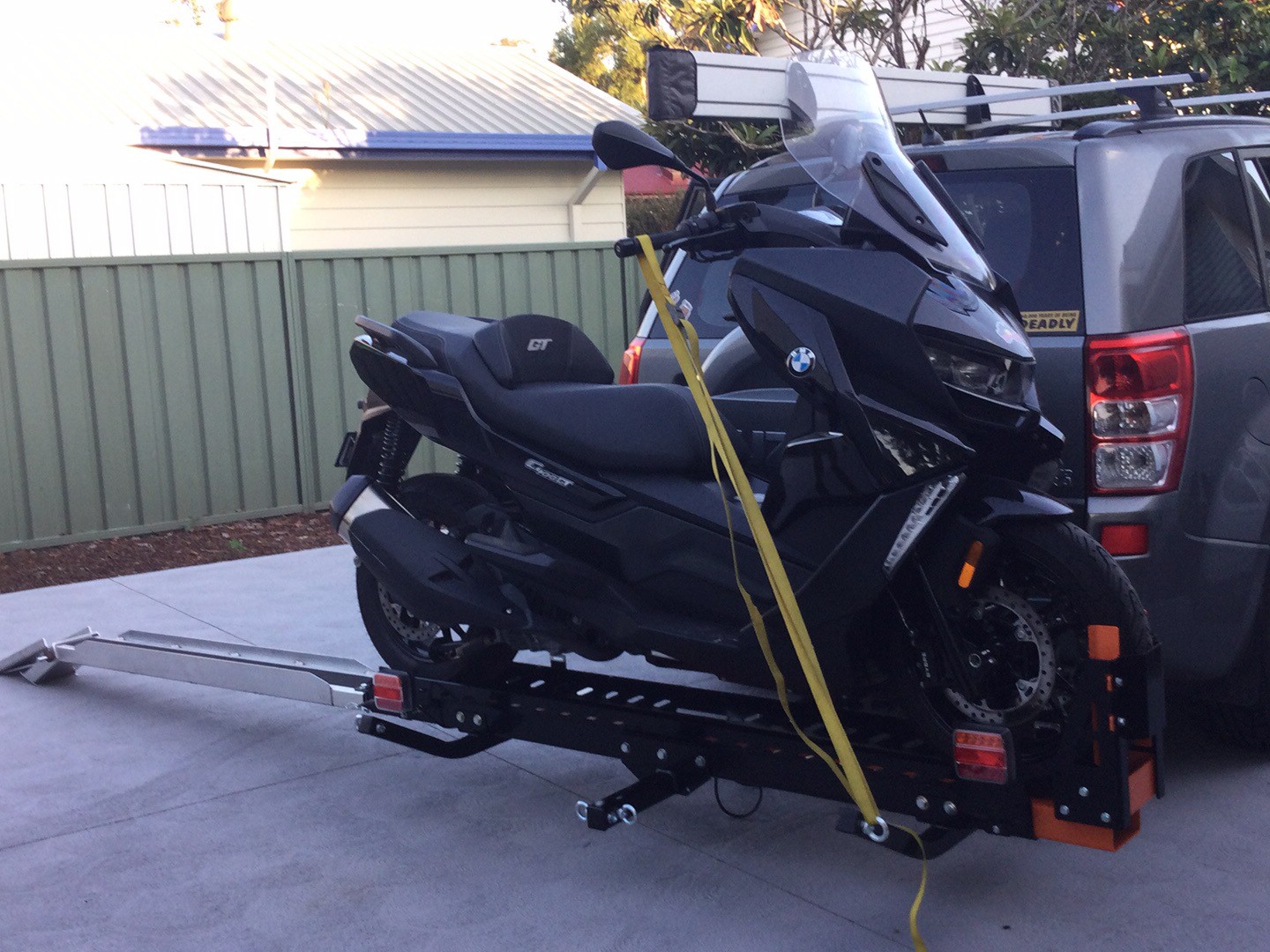 it is not intended for the Suzuki but the thought did cross my mind in towing the Suzuki with the scooter on the back but the Suzuki was doing wheel stand