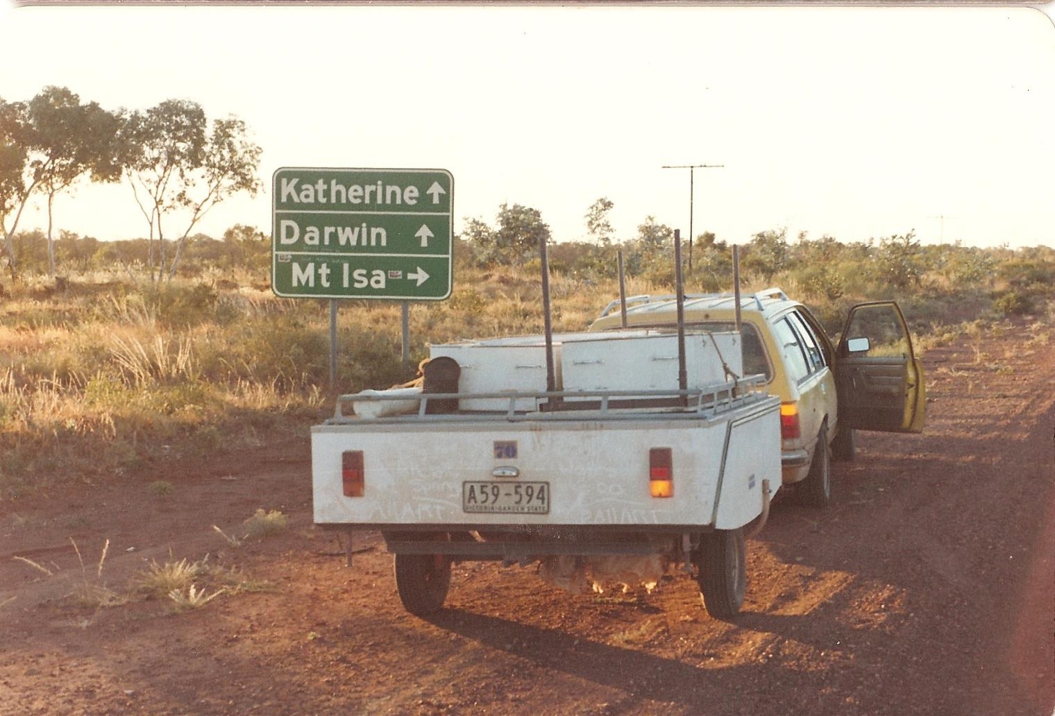 Crossing the border from the NT back into SA on the Stuart Highway on our honeymoon in 1967.
