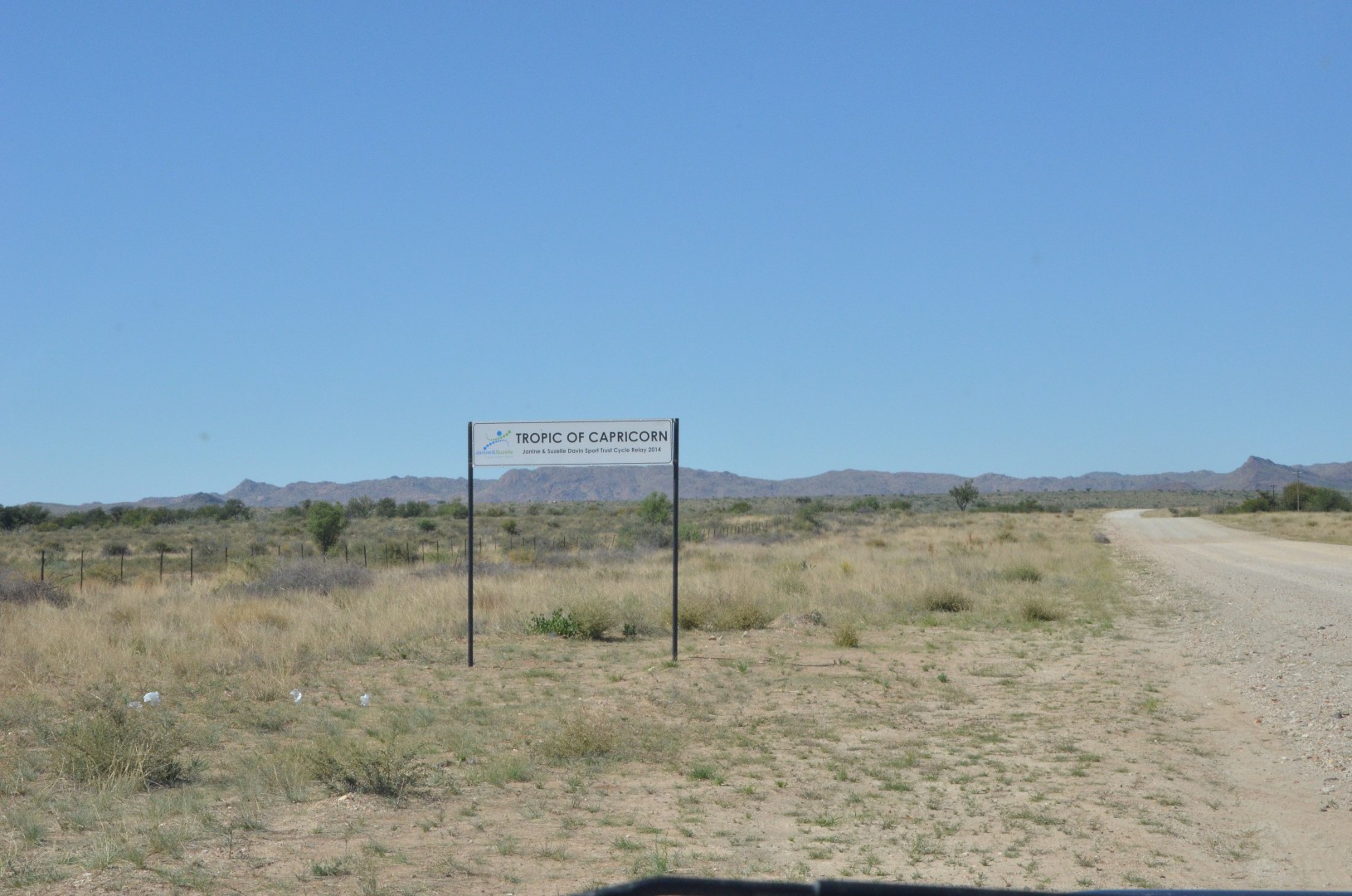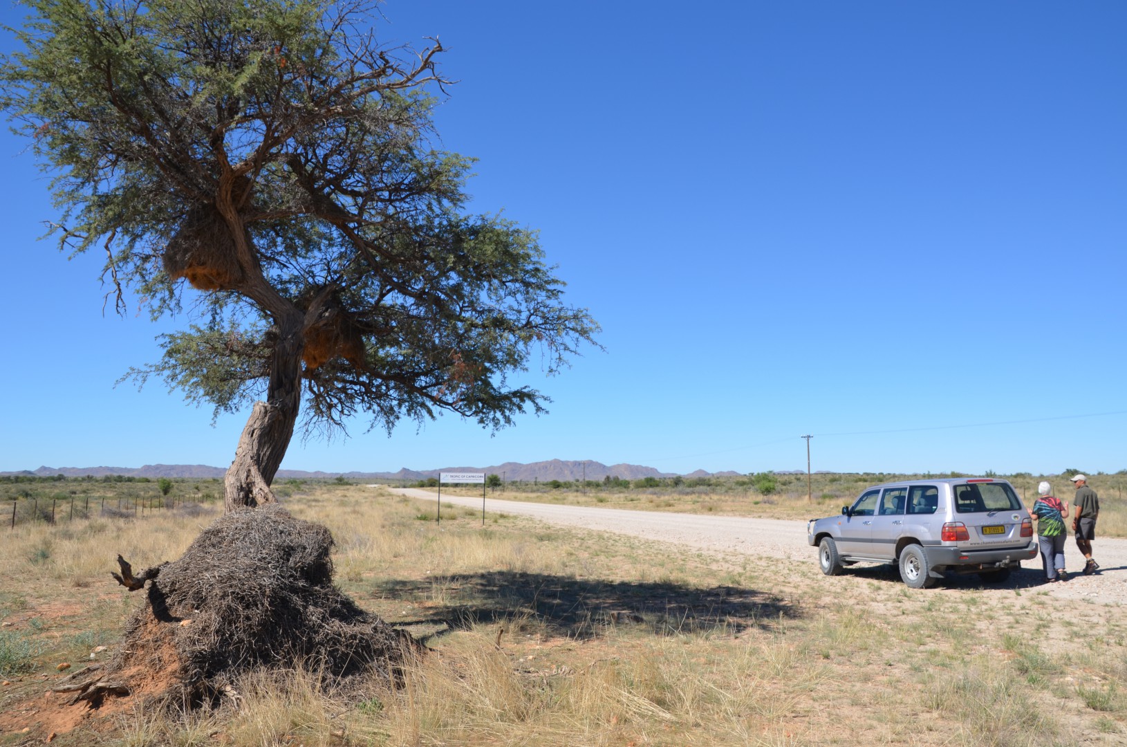 Tropic of Capricorn in Namibia, Africa. Between Windhoek and Sossusvlei. The birds nests are made by Sociable Weavers, they can get so heavy the branch can break off.