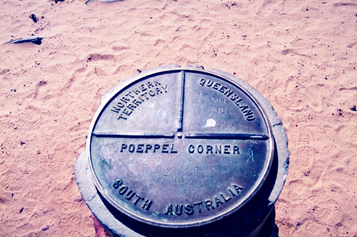 Crossing the border from the NT back into SA on the Stuart Highway on our honeymoon in 1967. It was "tradition" at that time to push the car across the border. I needed to take the pic of course.
