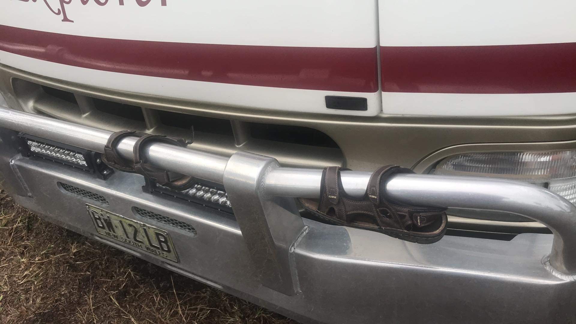 I have a pair of uggy type boots made in India, I punched a hole in them, threaded a small piece of rope tough them and tie them to the roof bars.