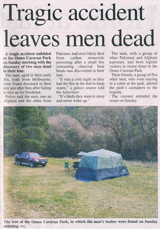 Two men dead overnight in a tent in the Omeo caravan park apparently from CO positioning from a gas heater - maybe jerry rigged?