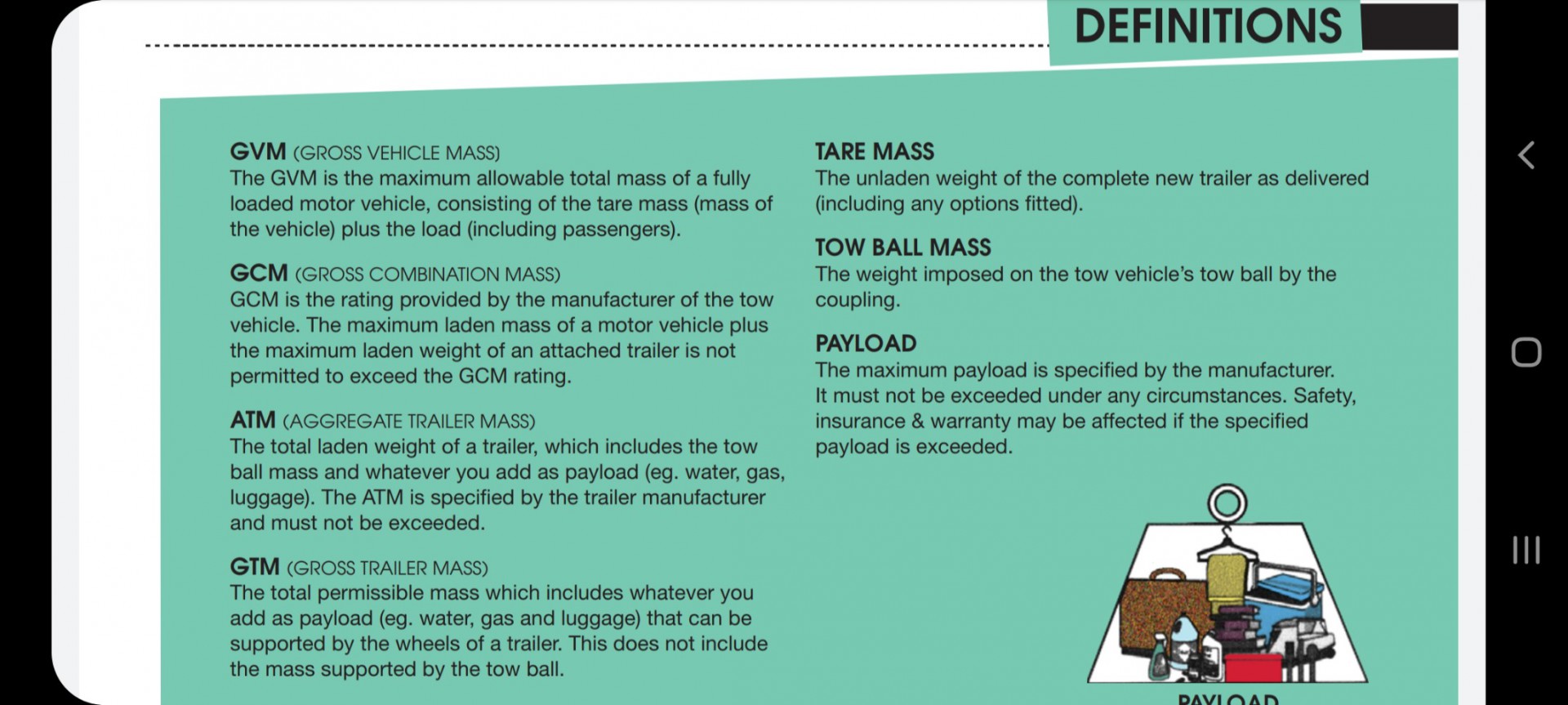 I too have weighed my van and vehicle after taking out everything removable including water and gas but with the vehicle I had full fuel tank. Since diesel weighs 832 grams per litre, I can calculate the empty weight with no fuel. Since Tare already has a definition, I can't say my empty weights are Tare as the purists amongst us would take up arms (and rightfully so). I call my empty van and vehicle weights "Empty weights". Funny about that. Armed with the knowledge of the ratings applied to my rig, I now know exactly what my payloads can be and how it can mixed and shared across the rig combination.