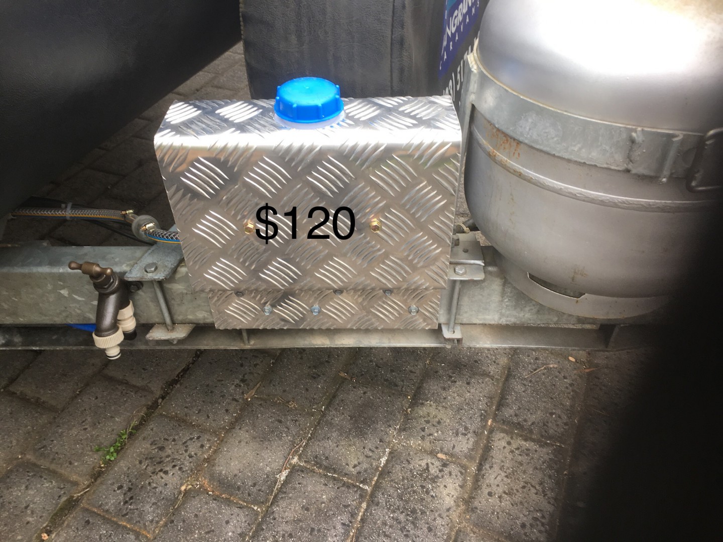 5 Litre Diesel Heater Tank & 2mm Checker Plate mount. Unique design simply fits over 50mm A frame or rear bar, complete with self drilling screws and LHS or RHS fuel connection.