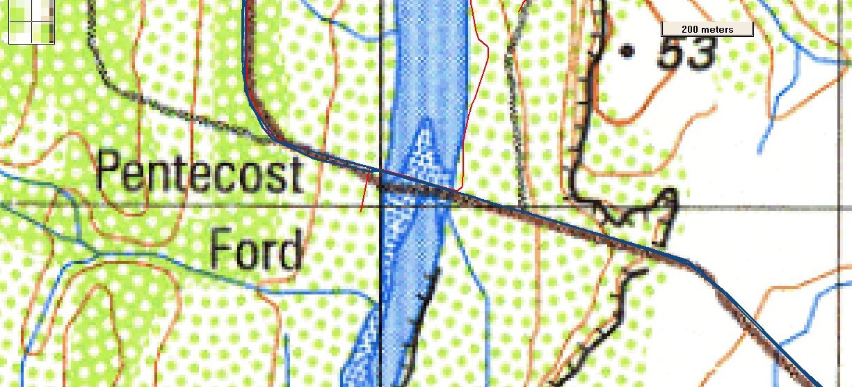 Some of the same tracks I posted before are displayed here on a 1:50,000 map, so there is much more detail. Where the red track meets the blue track Bottom centre)is the Pentercost River crossing at the northern end of the GRR.