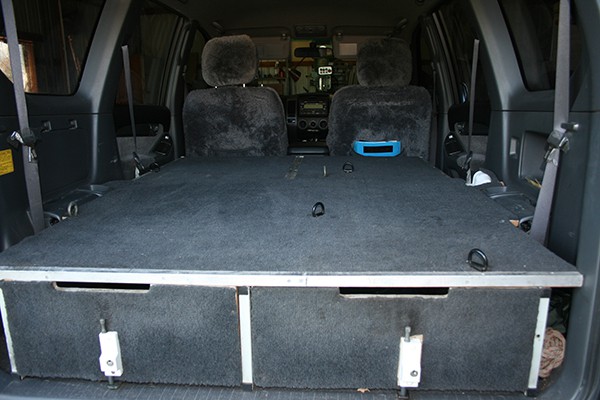 Our previous vehicle was a Toyota 80 series,Made a set of drawers that fitted behind middle seat.On long trips took out the middle seat and made a false floor.