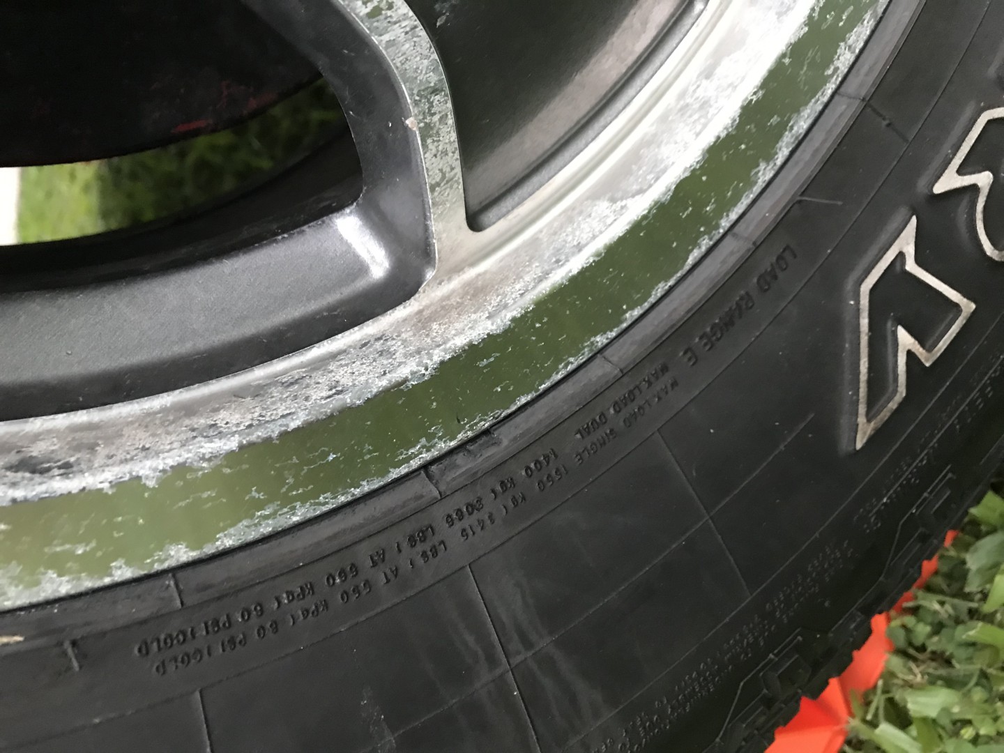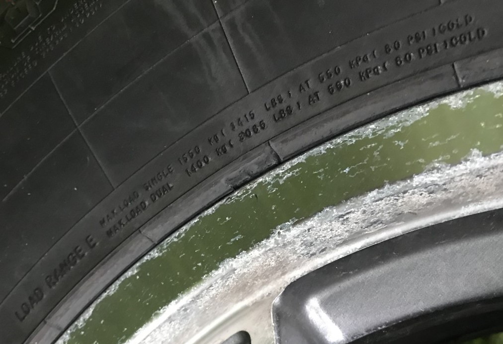 In an enlargement of the photo that shows the whole wheel rim of Rob's wheel, it is possible to read that the tyre is a light truck type.